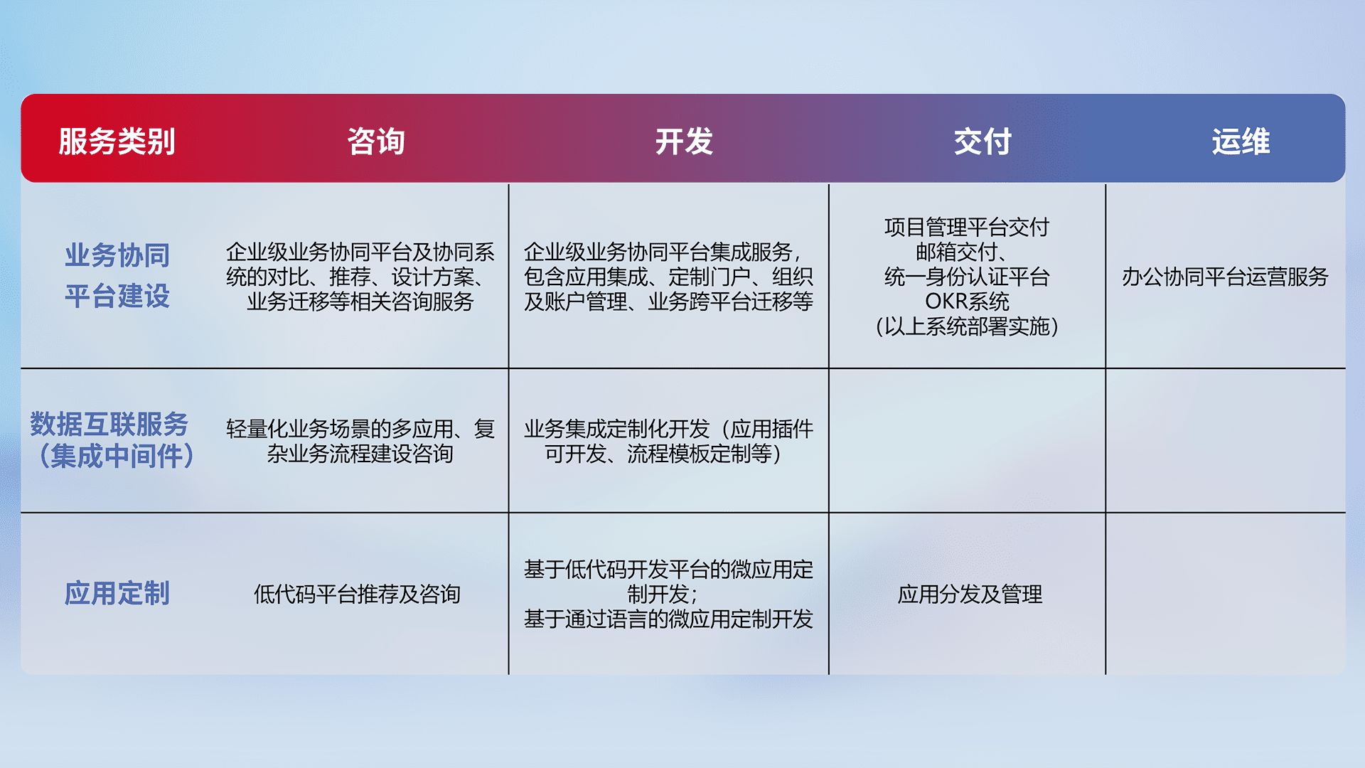 针对钉钉、、企微、、、IDaas等平台级产品提供产品的规划、、、、方案、、、交付、、、、定制化开发等服务,,,实现如统一协同办公、、、智能客户服务、、、、混合会议管理、、智能数据查询、、等业务场景,,,,实现数字化转型。。。